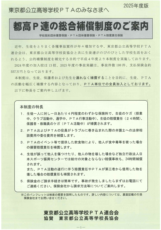 近年、生徒をとりまく各種事故案件が年々増加する中、東京都公立高等学校PTA 連合会は、東京都公立高等学校校長協会とともに生徒たちがのびのびとした学校生活をおくれるよう、公的補償制度を補完する目的で、平成4年度より本制度を実施しております。