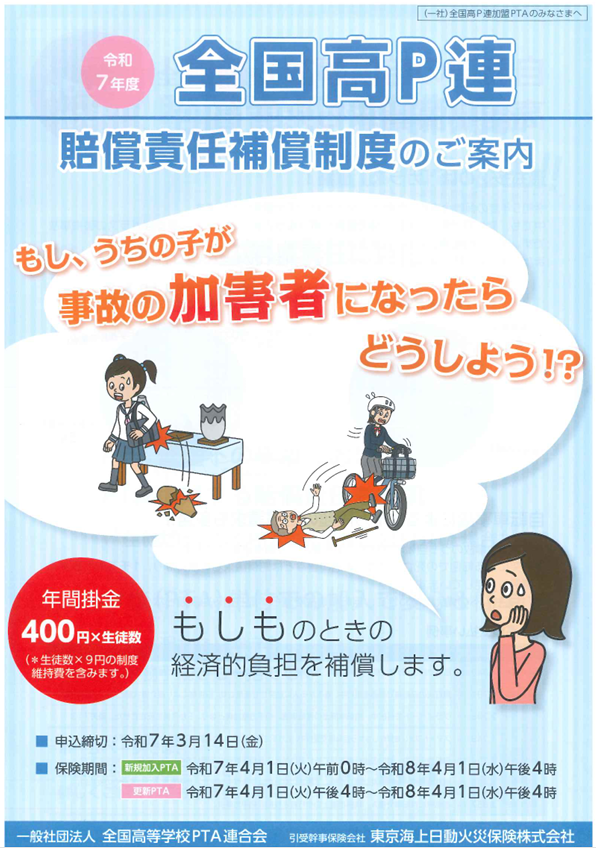全高P連の賠償責任補償制度については、全高P連のホームページ から、メニューの[賠償責任補償制度]をクリックして ご覧下さい。